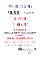 こんばんは☆彡さかな竹二久郎(たけふくろう)です今月(「師走」=12月)の「休業日」をご案内いたしますm(_ _)m。1日(月)「休業」でございますので毎週日曜日が...