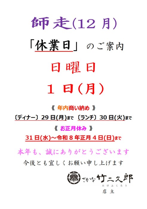 師走(12月)「休業日」のご案内